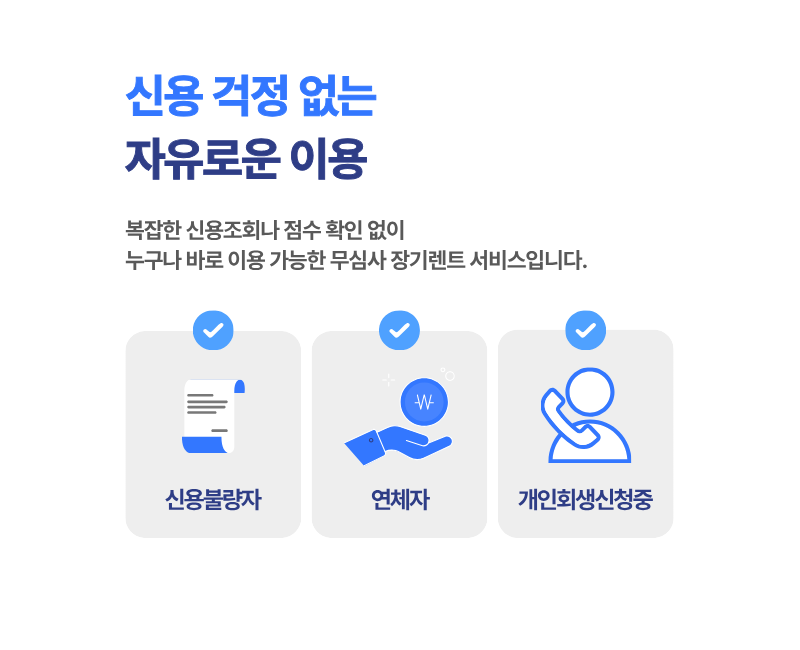 신용등급과 관계없이 차량 이용이 가능하며, 신용점수 하락에 대한 부담도 없습니다.